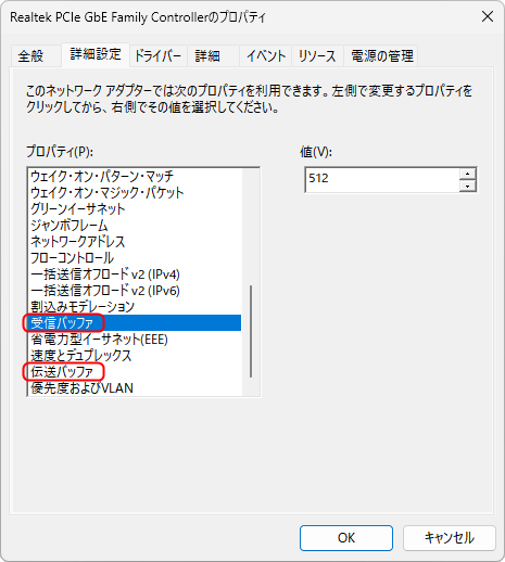 3. 送信バッファー・受信バッファーの設定を変更する(※環境によってはパフォーマンスが低下する可能性あり)